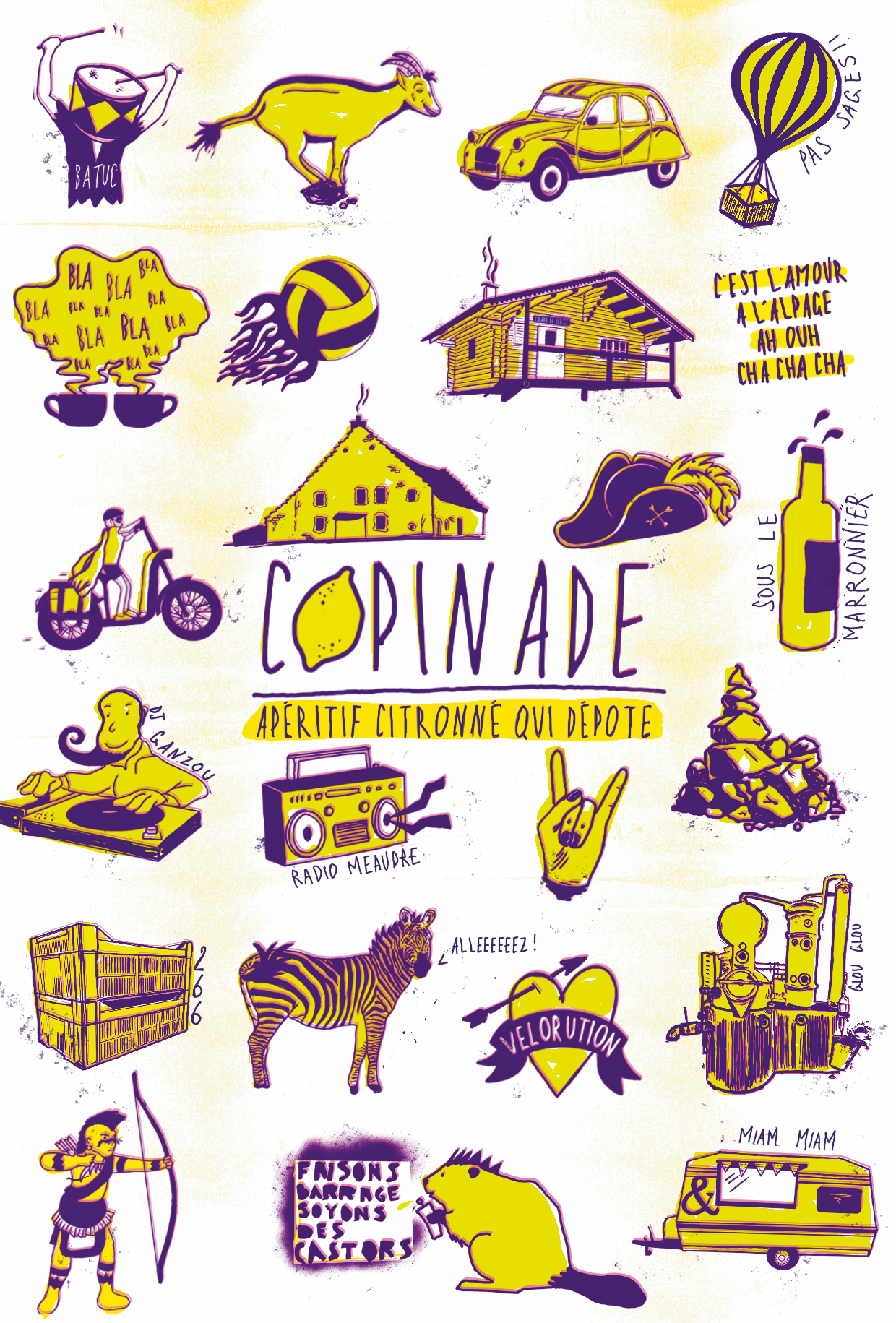 Dans le cadre du projet éphémère L'EntrePotes, j'ai créé l'identité d'une boisson citronné inventée par L'Entropie. J'ai proposé un nom, une tagline et une illustration qui fait référence à des anecdotes locales vécues avec des copaines du territoire. Une boisson 100% vertacomicorienne !
